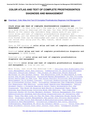 Read Online Color Atlas and Text of Complete Prosthodontics Diagnosis and Management Doc online is a convenient and frugal way to read Color Atlas and Text of Complete Prosthodontics Diagnosis and Management you love right from the comfort of your own home. Yes, there sites where you can get Doc "for free" but the ones listed below are clean from viruses and completely legal to use.